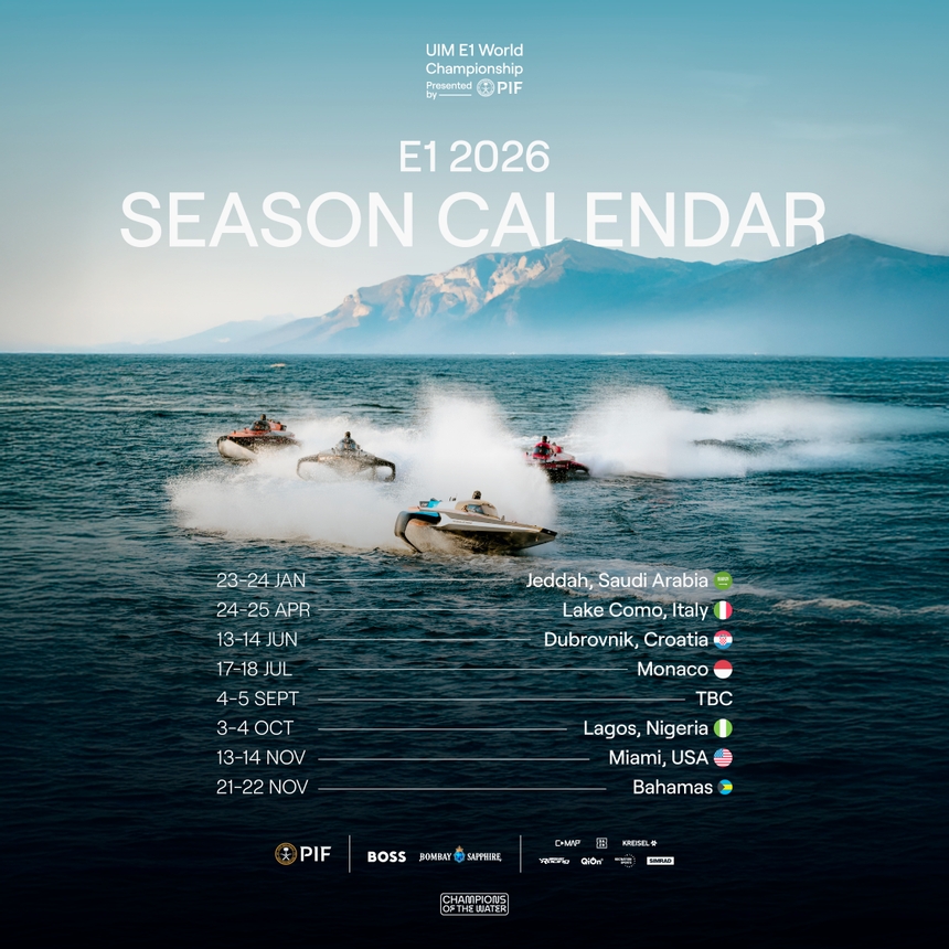 The 2026 season builds on E1’s growing success and global momentum, following a landmark 2025 campaign that saw sell-out crowds, new E1 teams and celebrity team owners, and the E1 RaceBirds pushing the limits of electric propulsion technology.